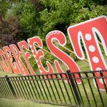 5ft Tall CNC cut dibond lettering with laminated vinyl print to face, installed with timber supports and stakes.